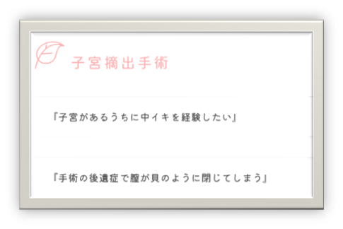 また、摘出前に女の身体であるうちにしっかりと感じておきたいとのご相談は多いです。(医師のOKがありましたら施術可能です)